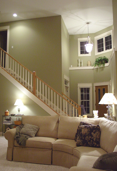 In the foyer of the home, an open staircase looks out onto a vaulted living